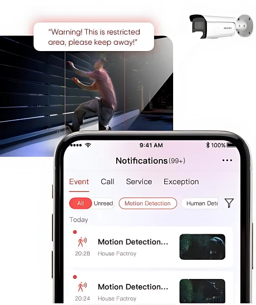 Our system accurately detects and classifies people or vehicles. It immediately triggers voice alarms and sends mobile alerts to stop intruders before any damage occurs.